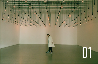 イレーヴのブルゾンとパンツにスティル バイ ハンドのコートを合わせたコーデ。アート作品が並ぶミニマルな空間でも映えるよう黒のワントーンで統一し、存在感を出している。素材感がそれぞれ異なるため、ノッペリとした印象にはならないだろう。また、足元のカジュアルなスニーカーが、適度な抜け感をプラスしている。