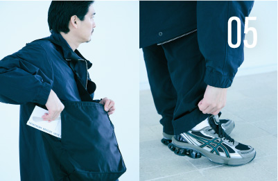 トレンドのトラックジャケットを取り入れたコーデ。こちらはUMBROと、ホワイトマウンテニアリングとのコラボアイテムだ。撥水加工を施したストレッチ素材を使用しているため、旅先でのちょっとした天候の変化でも慌てない。袖下のマチで動きやすさをカバーしているので、移動の多くてもストレスにはならないだろう。ゆったりとしたリラックスシルエットもうれしい。